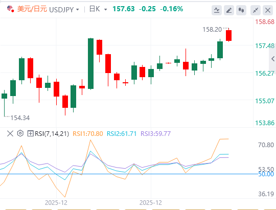 1月12日,周一亚洲早盘,美元/日元在158.05附近上涨。日本首相高市早苗考虑在二月上半月举行议会提前选举后,日元兑美元兑美元走弱。