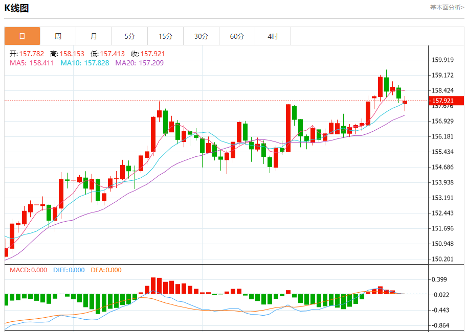 周一盘中,美元/日元报157.973,跌幅0.06%。