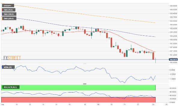 美元/日元自低位反弹,目前仍未突破107.00关口。4小时图表显示美元/日元遇阻持续看跌的20SMA后加速下跌,随后跌破长期均线。美元/日元动能指标处在消极区域,方向不明朗,相对强弱指标与超卖交叉,目前该水平处在32,表明美元/日元倾向于下行。