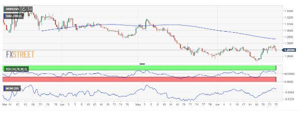 汇价短暂突破5月高位后,汇价重返近期相同区间。料进一步跌向持平的20日均线1.2660;如破下行压力将加剧,料进一步下跌。动能指标跌破100;关键阻力位于1.2750。汇价料继续整理于1.2715和1.2670之间,风险偏下行,汇价位于1.2700下方,也位于4小时图20SMA下方。