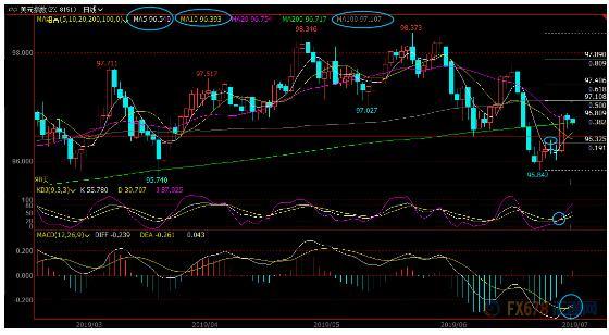 下方5日均线支撑在96.53附近,10日均线支撑在96.39附近,若意外回落至该位置下方,则削弱短线看涨信号。