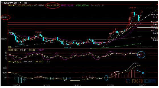 隔夜高点阻力在1320.91附近;10日均线支撑在1408.79附近,在失守该位置前,后市多头都有机会;进一步支撑在1400整数关口附近,若金价回落至该位置下方,则增加M顶的可能性。