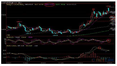 不过,上一交易日金价录得较长的上影线,而且KDJ已经步入超买区域,后市金价存在震荡回调的可能性;较强的支撑在1400整数关口附近,10周均线支撑在1374.80附近,若意外回落至该位置下方,则增加见顶信号。