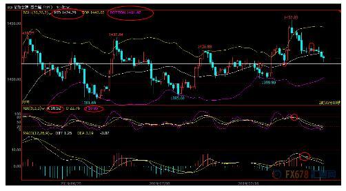 上方留意1430整数关口附近阻力,若能顶破该阻力,则削弱短线看空信号;进一步阻力在6月份高点1438.75附近;强阻力在布林线上轨1449附近。