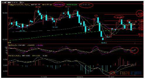 若失守布林线中轨97.16附近支撑,则可能汇价进一步试探布林线下轨96.81附近支撑。