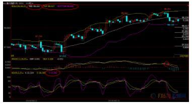 日线级别:震荡上涨守住;KDJ金叉但J线拐头,MACD金叉但信号较弱,汇价受到5月23日高点98.37附近阻力压制,短线走势变数较大,若能再次顶破该阻力,则增加短线看涨信号,汇价有望进一步涨向前期高点98.94附近,布林线上轨阻力目前在98.68附近。