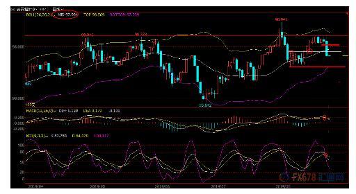 若不能收复98.08附近阻力,则后市汇价仍有下行风险,布林线下轨支撑目前在97.24附近,若下破该支撑,则增加后市看空信号。