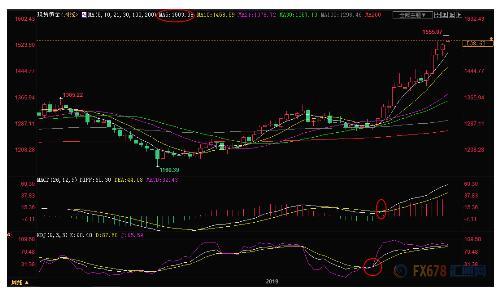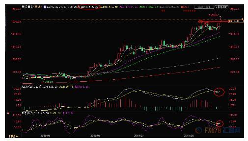 解析:市场对国际贸易局势的担忧,全球股市大幅下跌,推升避险情绪,一度帮助金价高开高走再创逾六年新高;但金价短线涨幅过大,已经消化了大部分利多因素,上方还有1555附近强阻力位,需要提防“靴子落地”行情和多头获利了结。