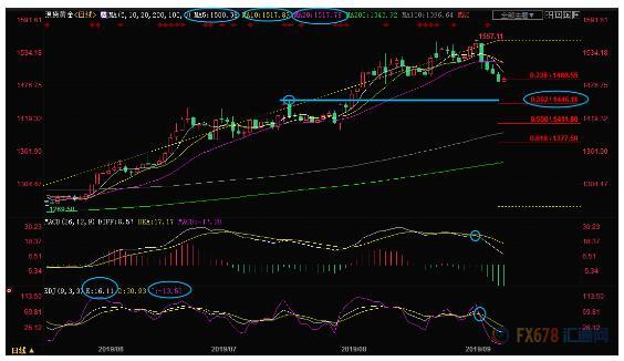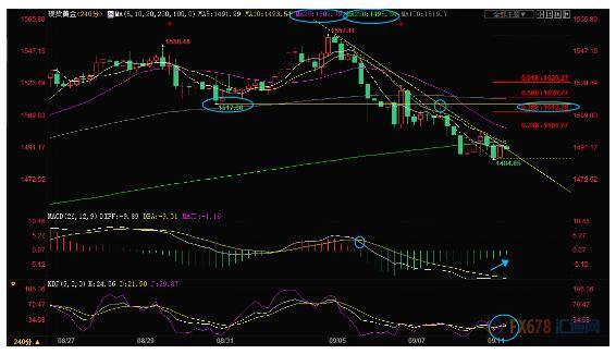 4小时级别:震荡下跌;K线在相对低位出现看涨吞没信号,KDJ金叉,MACD绿色柱萎缩,短线走势变数增加,可能会存在小幅上涨的机会,200均线阻力在1495.35附近,20均线阻力在1502.87附近,若收复该位置,则可能会再次试探1515.58附近阻力。另外,短线跌势的38.2%回撤位阻力在1512.28附近。