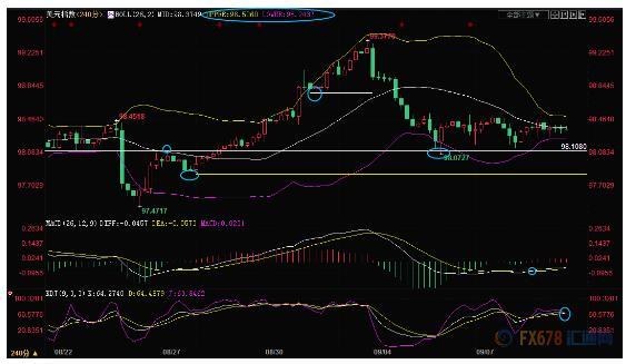 4小时级别:窄幅震荡;布林线收口,留意布林线轨道98.24-98.50区域突破情况。目前KDJ有死叉趋势,MACD金叉,短线后市缺乏明确方向。