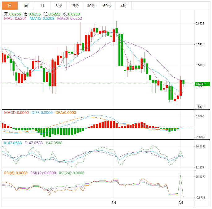 纽元兑美元下跌了约0.27%,从0.6257的高点跌至0.6238的低点,回吐了周中在数据显示中国需求复苏提振大宗商品价格后的部分涨幅。
