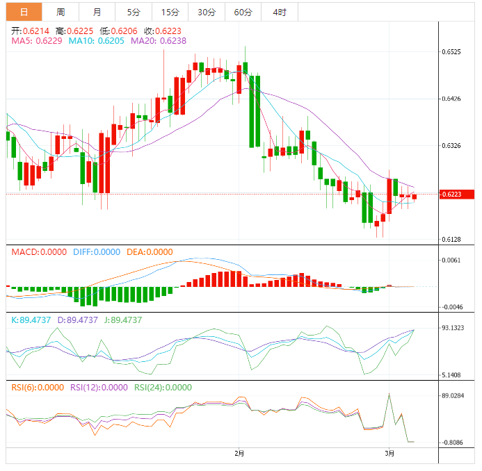 纽元兑美元回落至0.6210,此前该货币对在周一早些时候出现了五年来的首次周上涨,因为市场情绪挑战了纽元兑美元的买家。在美联储主席杰罗姆·鲍威尔半年度证词和美国2月份就业报告之前,市场的谨慎情绪为这句话提供了线索。