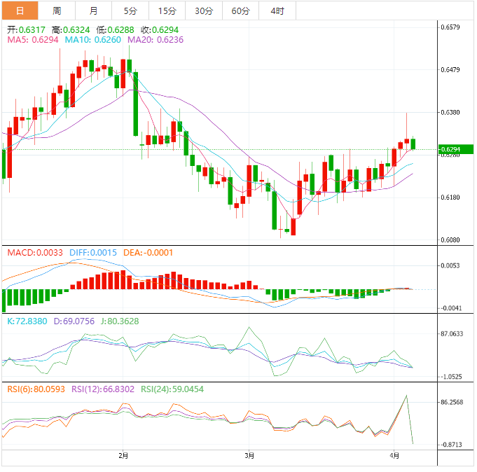 技术分析,截至发稿时,纽元兑美元仍在测试一个月支撑线0.6245左右,除非突破两个月阻力位0.6385-90。