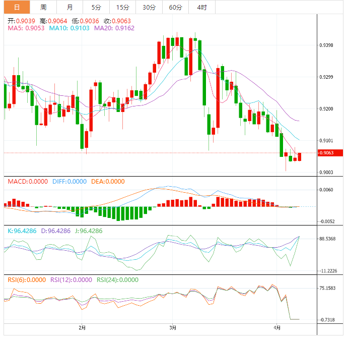 周一欧洲市场盘前,美元兑瑞郎在周一复活节早些时候刷新了接近0.9065的盘中高点。瑞士法郎(CHF)延续了昨日从22个月低点反弹的势头,同时逼近一个月支撑位转变为阻力位的0.9075附近。