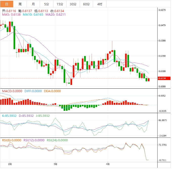 10期和20期指数移动平均线(ema)分别下跌至0.6162和0.6190,表明未来将进一步走软。