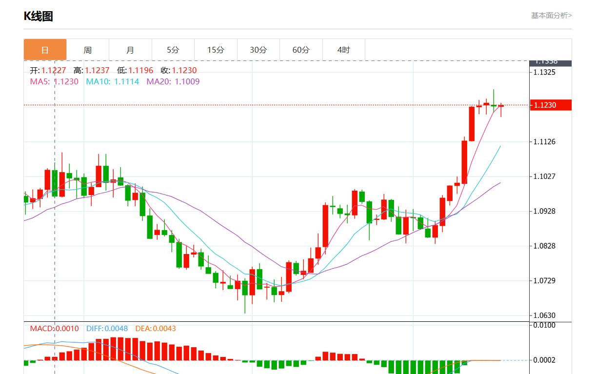周三欧市盘中盘中,欧元/美元最新报1.1234,日图涨0.05%