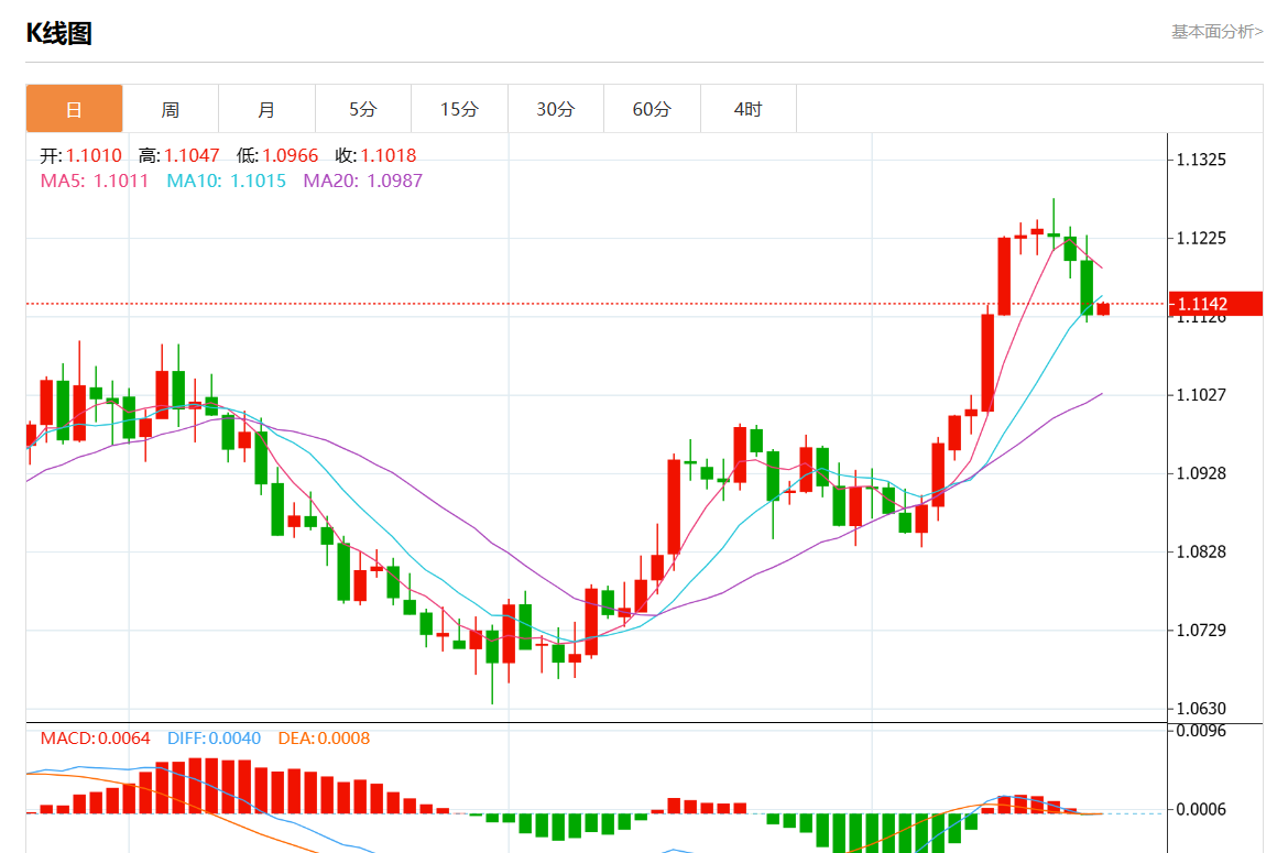 周五欧市盘中,欧元/美元最新报1.1137,日图涨0.07%