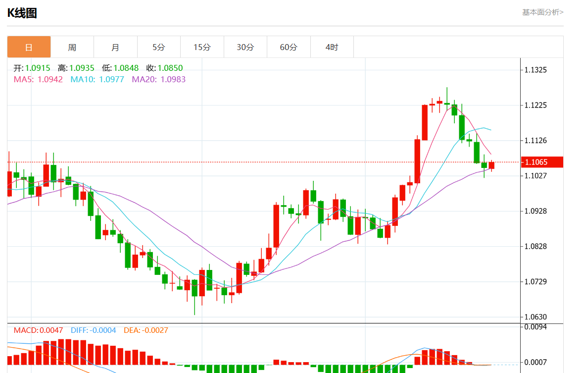周二欧市盘中,欧元/美元最新报1.1068,日图涨0.16%