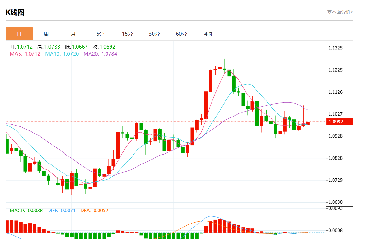 周五欧市盘中,欧元/美元最新报1.0999,日图涨0.16%