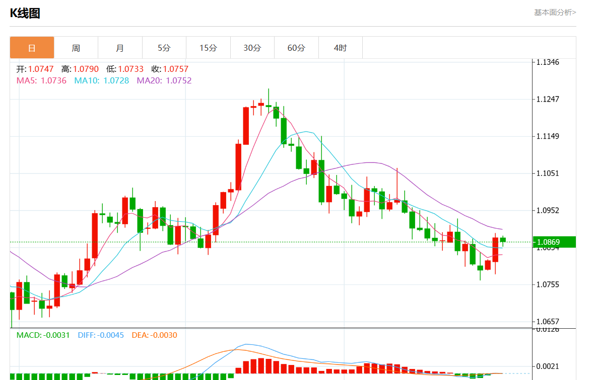 周三欧市盘中,欧元/美元最新报1.0869,日图跌0.19%