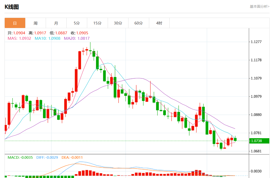周三欧市盘中,欧元/美元最新报1.0742,日图跌0.10%.