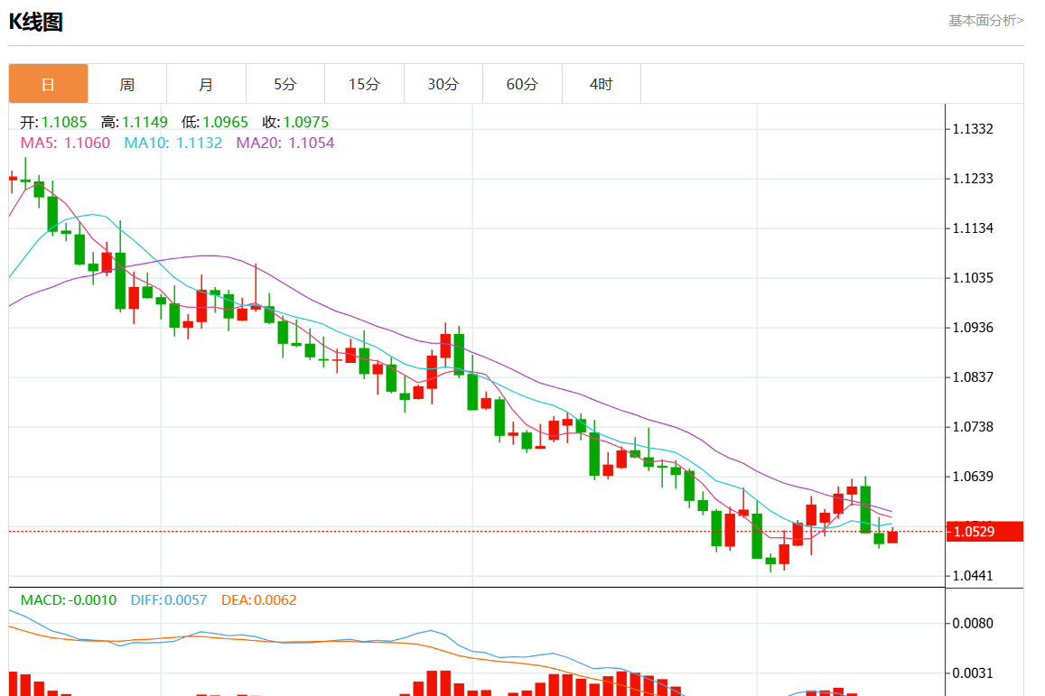 周一欧市盘中,欧元/美元最新报1.0532,日图涨0.24%.