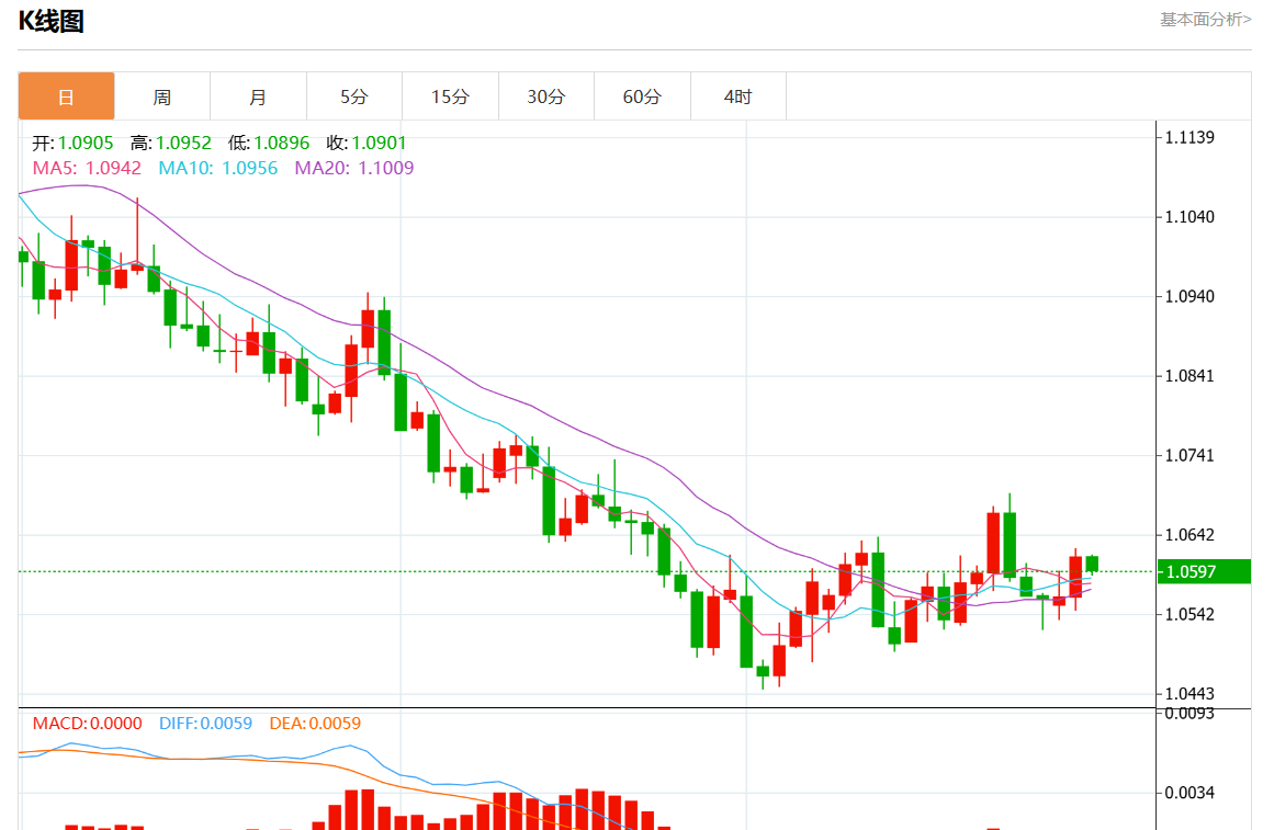 周二欧市盘中,欧元/美元最新报1.0595,日图跌0.19%.