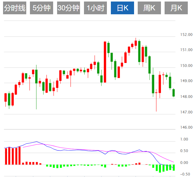 今日预期交易区间在147.30支撑位和148.80阻力位之间