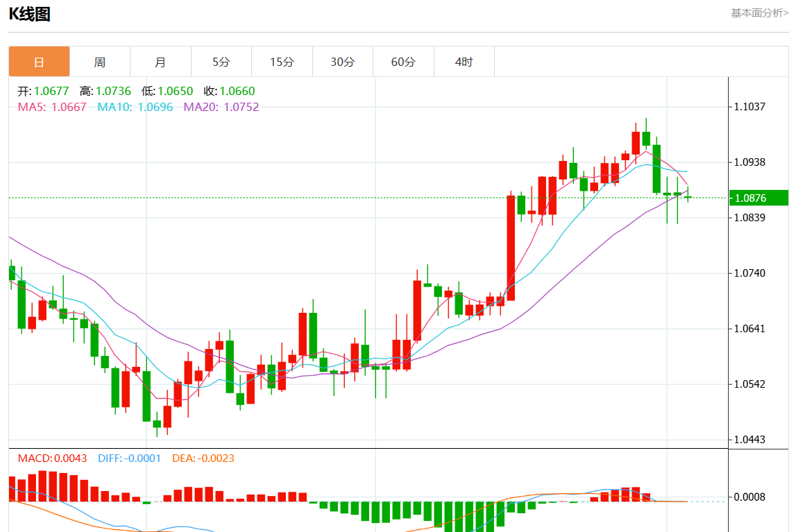 周一欧市盘中,欧元/美元最新报1.0874,日图跌0.06%.