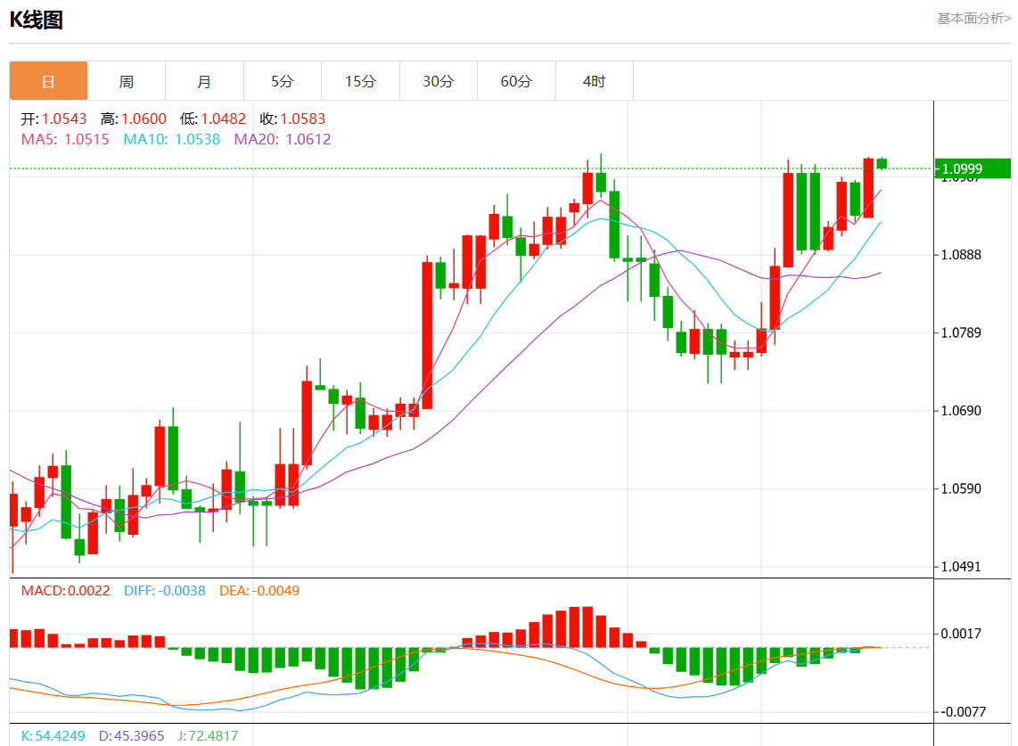 周五欧市盘中,欧元/美元最新报1.0999,日图跌0.10%.
