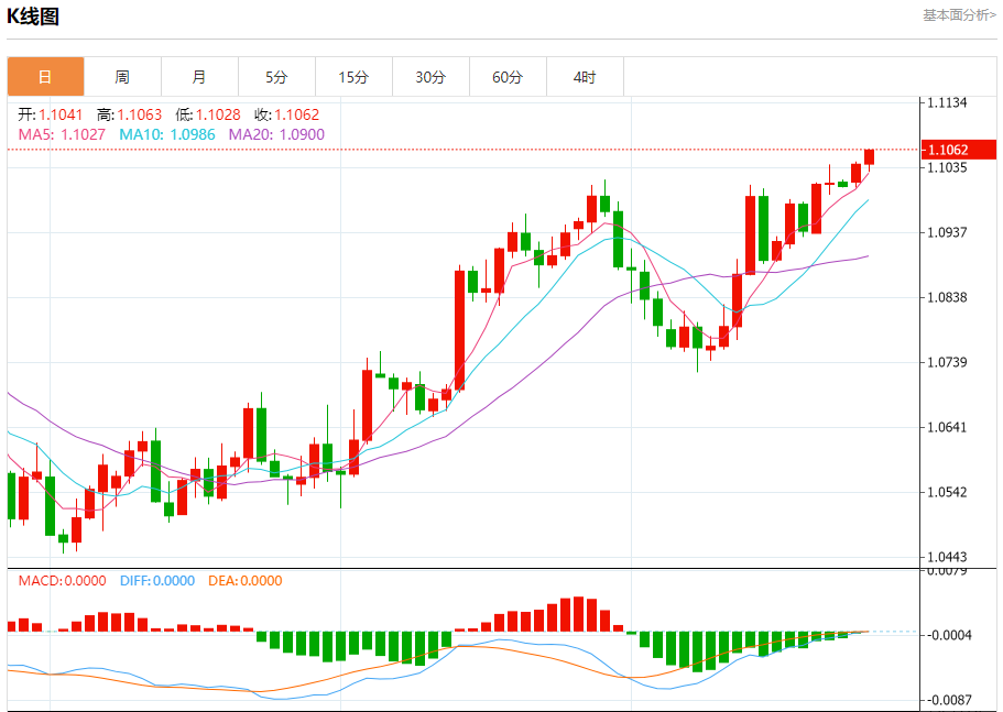 汇价高见1.1063,低见1.1028。上一交易日,汇价收于1.1042。