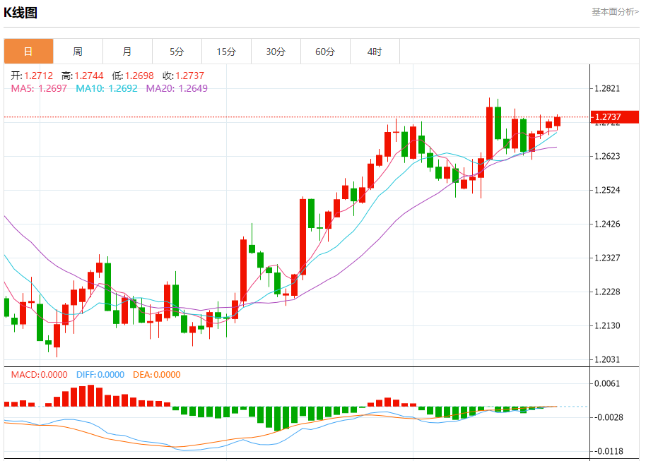 汇价高见1.2744,低见1.2698。上一交易日,汇价收于1.2724。