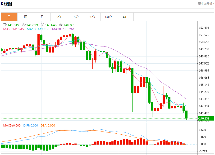 汇价高见141.819,低见140.646。上一交易日,汇价收于141.811。