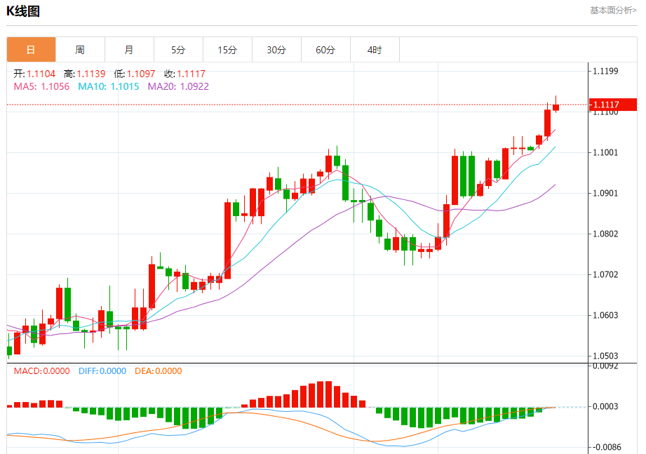 汇价高见1.1139,低见1.1097。上一交易日,汇价收于1.1105。