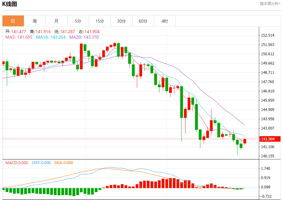 汇价高见141.883,低见141.287。上一交易日,汇价收于141.012。