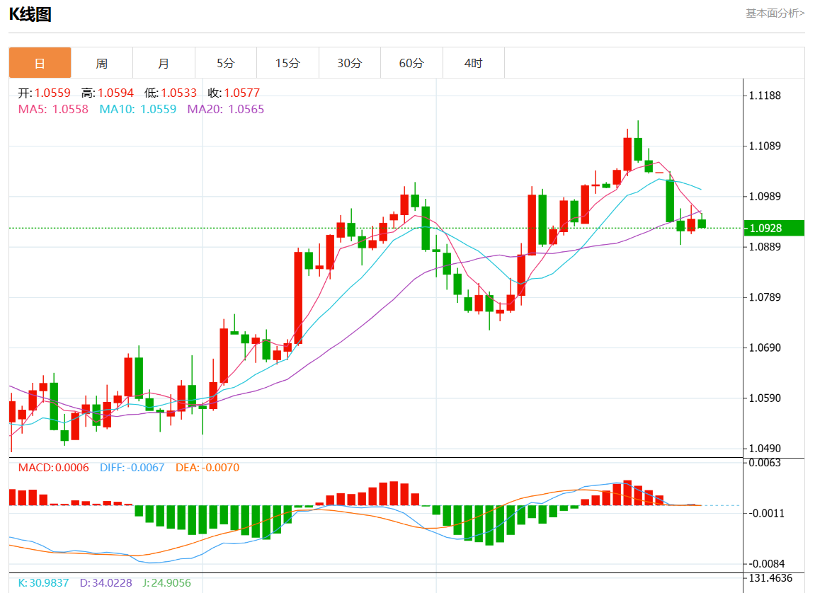 周五欧市盘中,欧元/美元最新报1.0928,日图跌0.15%.