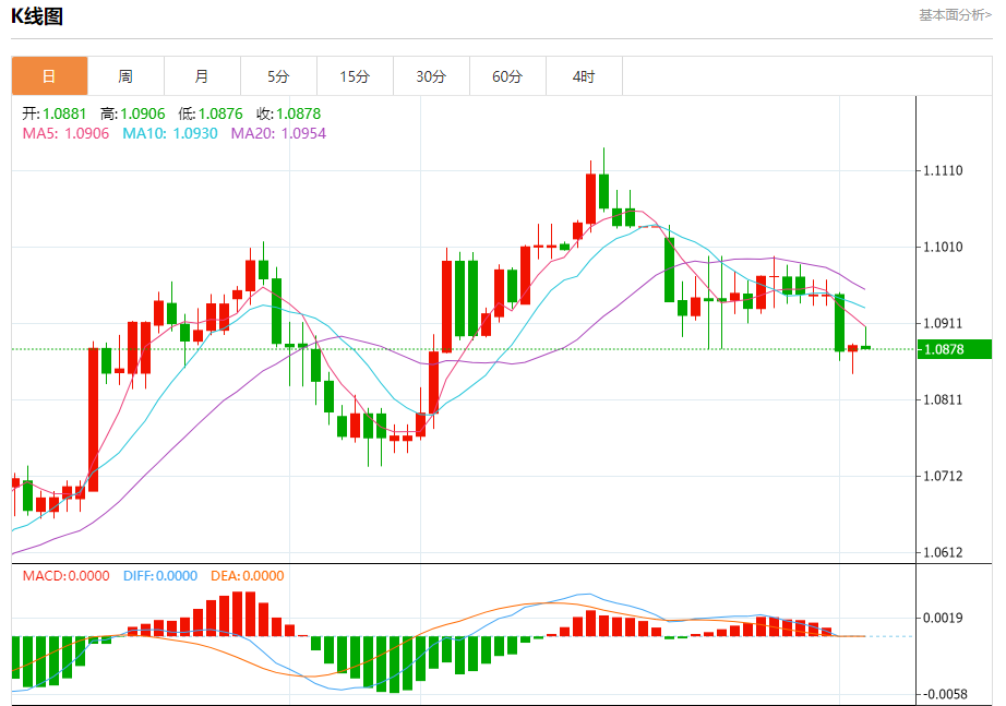 汇价高见1.0906,低见1.0876。上一交易日,汇价收于1.0882。