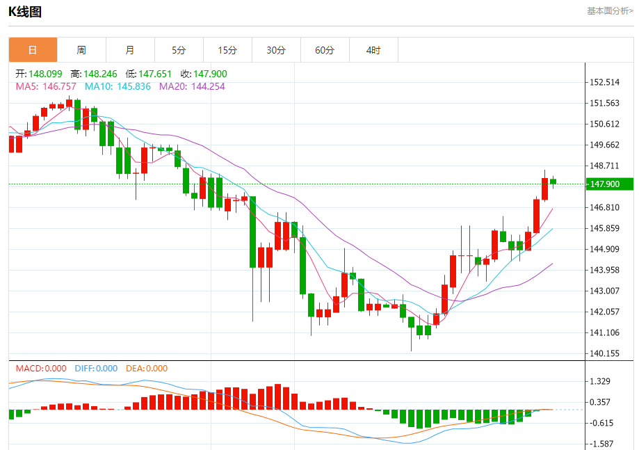 汇价高见148.246,低见147.651。上一交易日,汇价收于148.139。