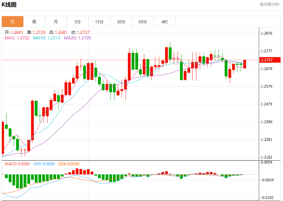 汇价高见1.2725,低见1.2681。上一交易日,汇价收于1.2701。