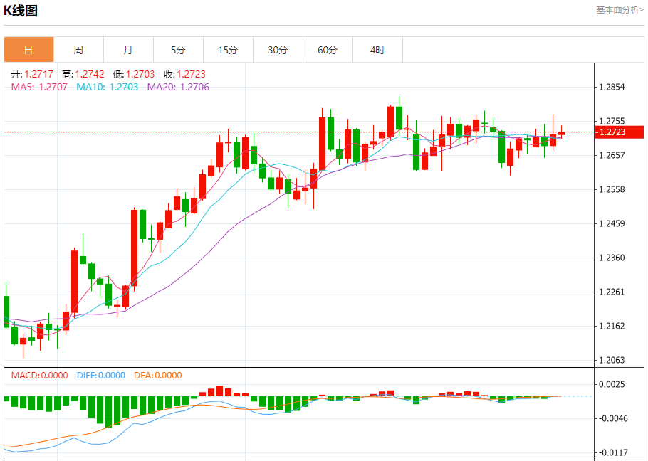汇价高见1.2742,低见1.2703。上一交易日,汇价收于1.2717。