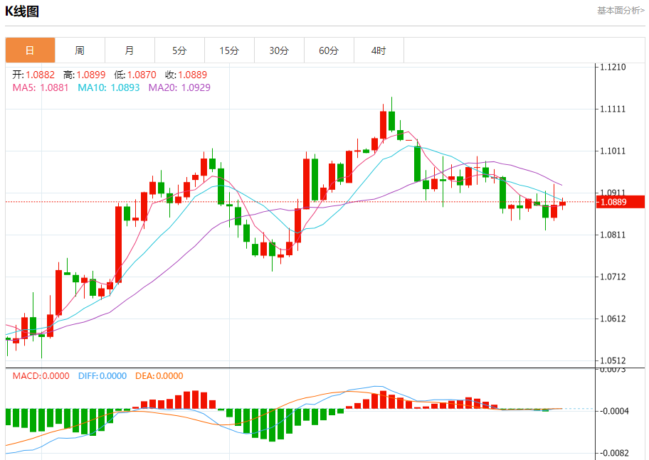 汇价高见1.0899,低见1.0870。上一交易日,汇价收于1.0882。