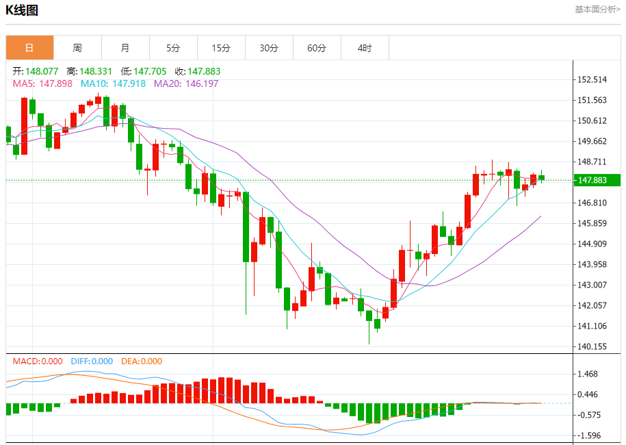 汇价高见148.331,低见147.705。上一交易日,汇价收于148.111。
