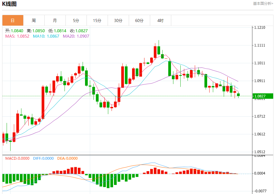 汇价高见1.0850,低见1.0814。上一交易日,汇价收于1.0853。
