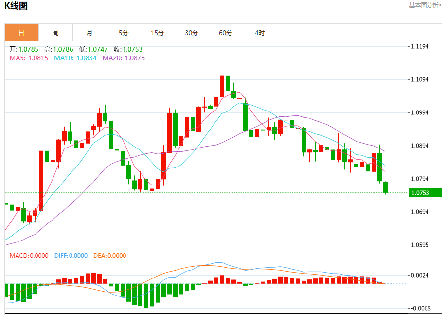 汇价高见1.0786,低见1.0747。上一交易日,汇价收于1.0788。