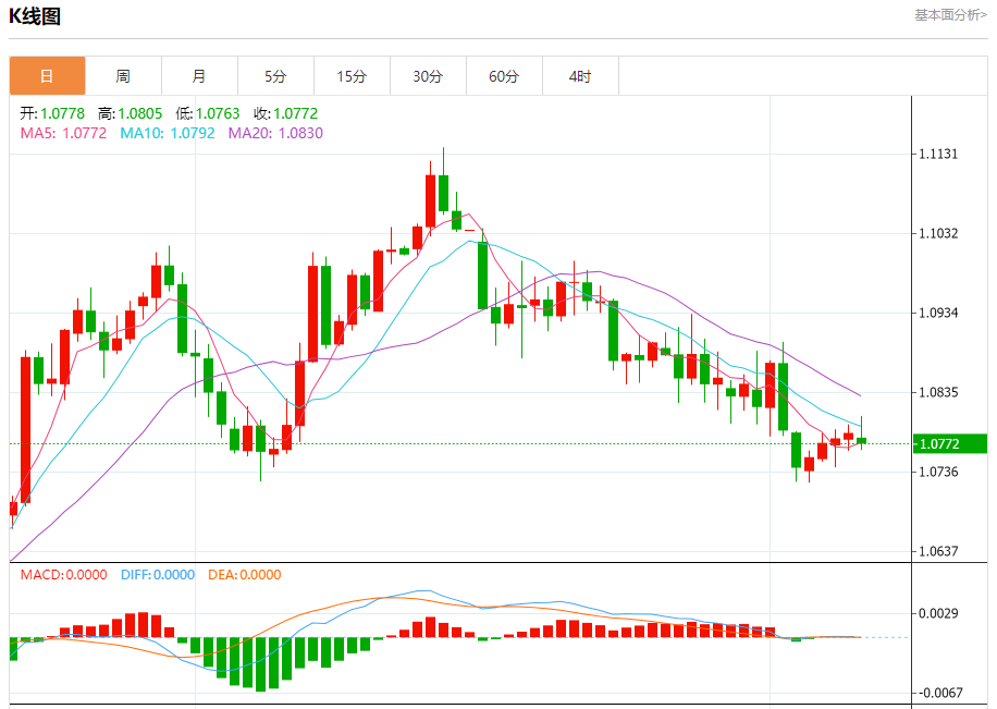 汇价高见1.0805,低见1.0763。上一交易日,汇价收于1.0784。