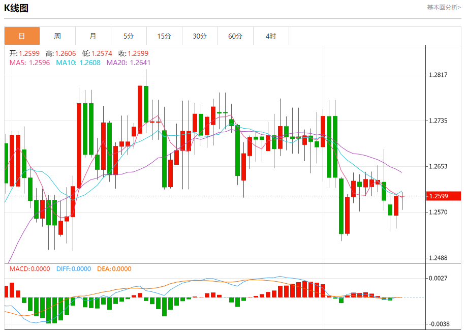 汇价高见1.2606,低见1.2574。上一交易日,汇价收于1.2599。