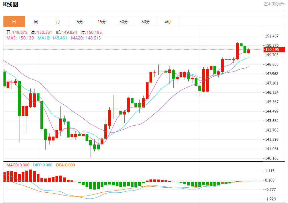 汇价高见150.361,低见149.824。上一交易日,汇价收于149.888。