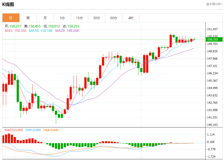 汇价高见150.455,低见150.012。上一交易日,汇价收于150.281。
