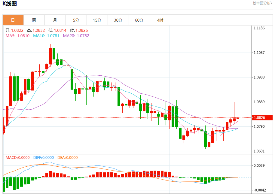 汇价高见1.0832,低见1.0814。上一交易日,汇价收于1.0822。