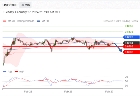 在 0.8820 之下,看跌,目标价位为 0.8795 ,然后为 0.8780 。